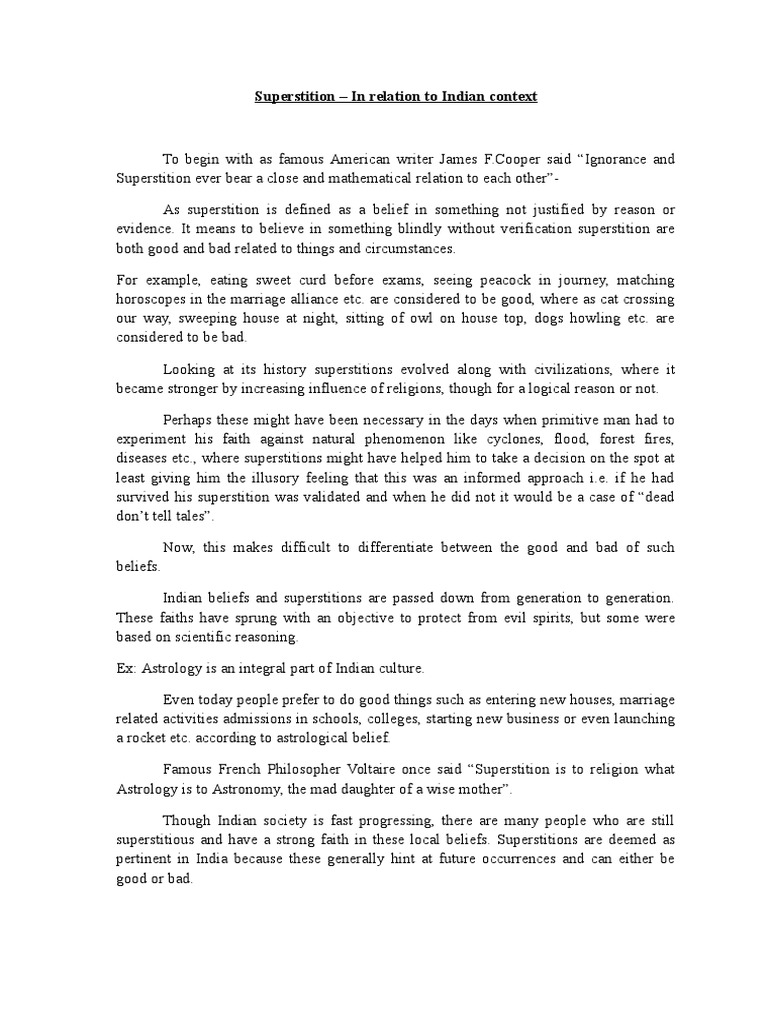 Superstition Essay: Superstition is superstitions essay but irrational belief in something. Weakness, fear, melancholy, together with ignorance are the true sources of superstition. If a Hindu believes that a dip in holy Ganges will wash away all his sins, it is just an irrational belief without any basis. It is often a tradition passed down to us from our forefathers. You can read more Essay Writing about articles, superstitions essay, people, sports, superstitions essay many more.